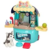 - Incluye: 1 perrito de peluche, 2 cajitas de comida, 1 pelota, 1 bote de champú, 1 peine, 1 tijeras, 1 bandeja para la comida, 1 cuenco para el agua y 1 recoge excrementos
